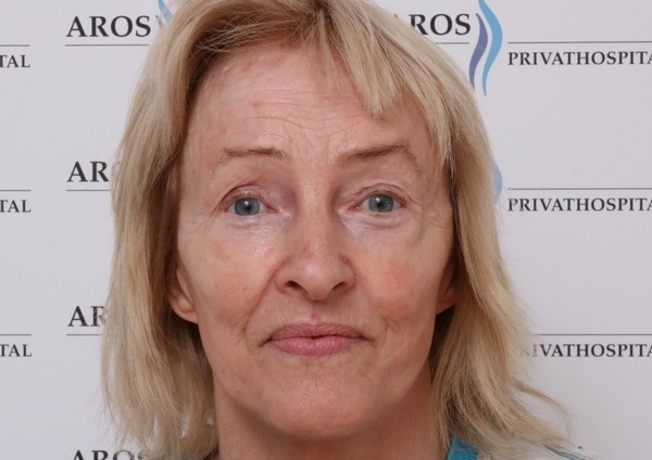 Efter fedttransplantation til nedre øjenlåg og kinder fortil, samt til furer ved mundvige efterfulgt af 2 gange fraktioneret CO2-laser til huden på øjenlåg og overlæbe, ser ansigtet betydeligt mere frisk og spændstigt ud. Hulhederne på og neden for øjenlågene er væk, lige som rynkerne og de grumsede pigmenteringer på øjenlåg og overlæbe