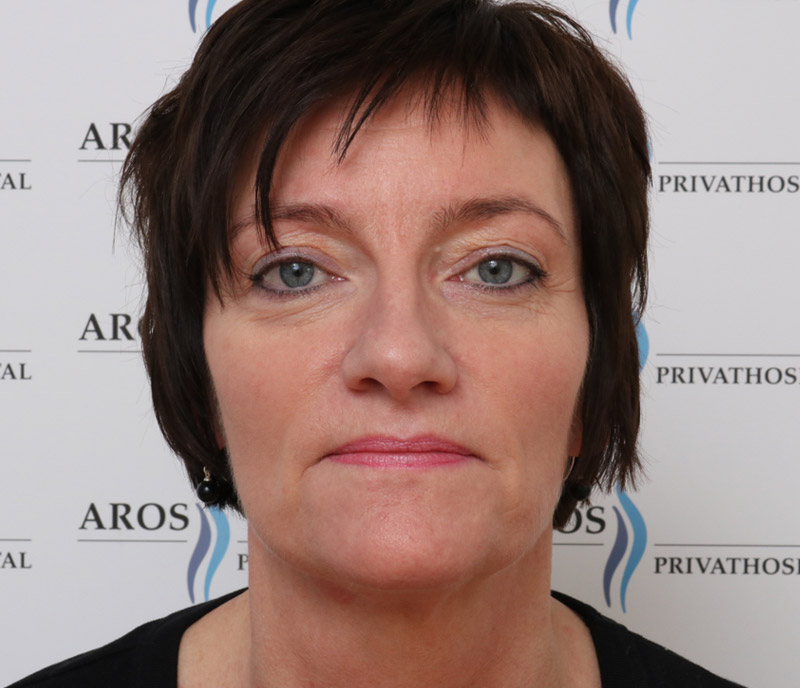 Behandlingsvalget bliver et MACS-løft kombineret med liposuction af nedre kinder-hals og løft af nedre øjenlåg. Helhedsindtrykket er et lettere, friskere ansigt med slankt, V-formet nedre ansigt uden tegn på operation.