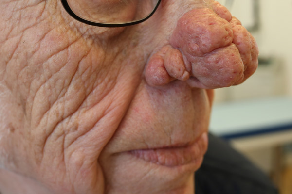 Patient med voldsomt stort rhinophym, som har fuldstændig deformeret næsen helt ned på undersiden.
