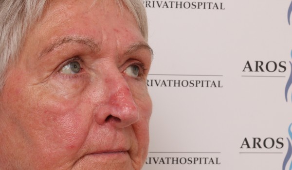 3 måneder efter en enkelt ablativ behandling er næsens dimensioner normaliseret. Men som det kan ses er selve sygdomsprocessen her ikke standset. Patienten kunne med fordel have accepteret en opfølgende hudterapi for dæmpning af betændelse og den røde hudtone